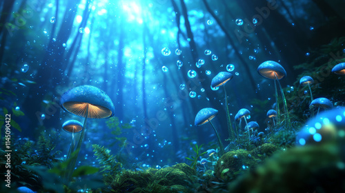 Fototapeta premium Glowing mushrooms illuminate a serene underwater forest in a captivating blue hue