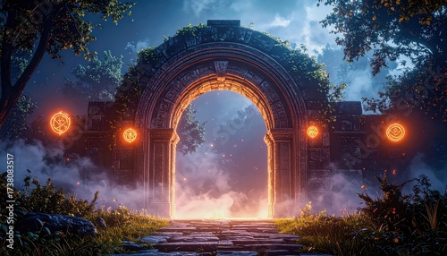 Fototapeta premium Glowing mystical portal surrounded by ancient ruins and eerie forest,...
