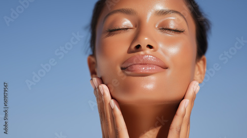 © Marut, Obraz premium Glowing natural skin on full face with smooth lips and closed eyes, showing serene and radiant expression under clear blue sky