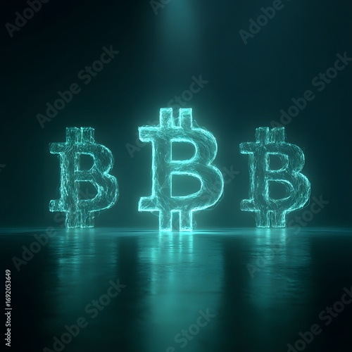 © Sharmin eps, Fototapeta premium Glowing neon bitcoin symbols reflecting on a dark surface symbolizing digital currency future