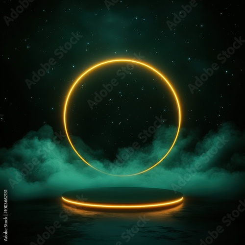 Obraz premium Glowing Neon Circle Above Platform With Fog And Stars