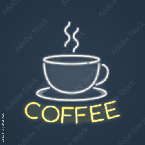 © Octopus182, Obraz premium Glowing neon coffee sign. Vector illustration.