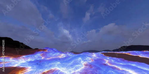 © Rachakrit, Naklejka premium Glowing neon desert dunes with fractal patterns and electric blue orange veins under twilight sky expressing surreal wonder