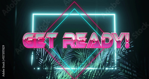 © vectorfusionart, Obraz premium Glowing neon GET READY! sign lighting palm fronds in club, featuring teal square pink diamond frame