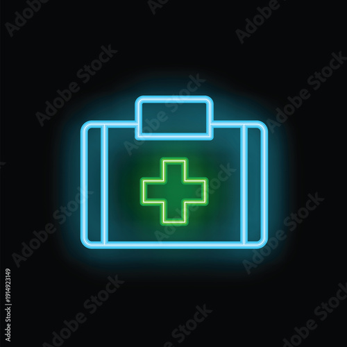 Obraz premium Glowing neon green medical cross inside a blue first aid kit on a black background