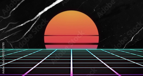 Obraz premium Glowing neon grid with cyan pink lines leading to scanline orange-red sun on retro marble backdrop