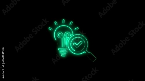 © MOMOTAJ, Obraz premium Glowing neon light bulb and magnifying glass with check mark on black background