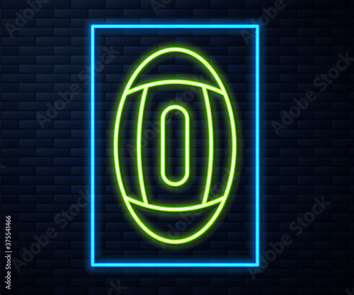 Obraz premium Glowing neon line American Football ball icon isolated on brick wall background. Rugby ball icon. Team sport game symbol. Vector Illustration.