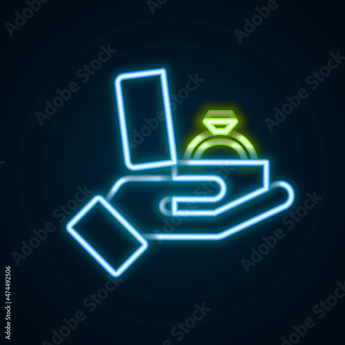 © Iryna, Fototapeta premium Glowing neon line Diamond engagement ring in a box icon isolated on black background. Colorful outline concept. Vector