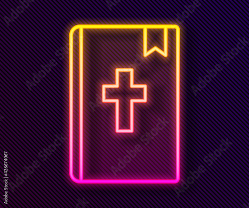 © Kostiantyn, Fototapeta premium Glowing neon line Holy bible book icon isolated on black background. Vector