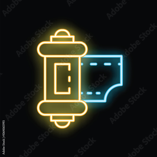 © ylivdesign, Fototapeta premium Glowing neon line photo camera film icon isolated on black background