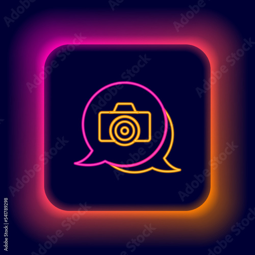 Obraz premium Glowing neon line Photo camera icon isolated on black background. Foto...
