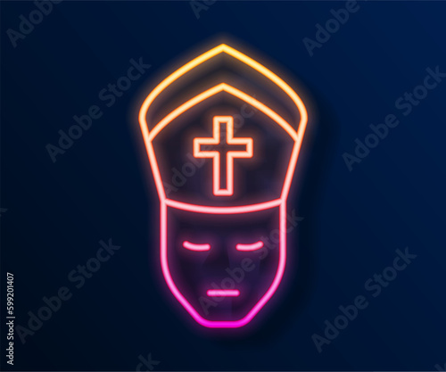 © Iryna, Obraz premium Glowing neon line Pope icon isolated on black background. Pope hat. Holy father. Vector