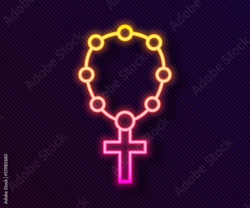 © Kostiantyn, Fototapeta premium Glowing neon line Rosary beads religion icon isolated on black background. Vector