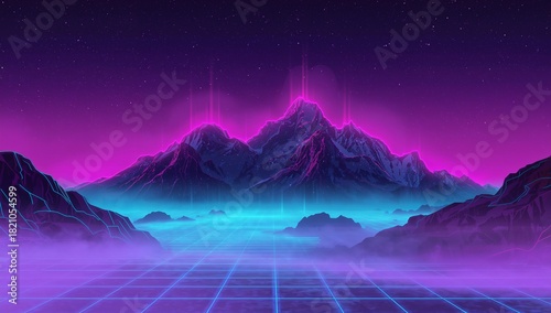 Naklejka premium Glowing neon-lit mountain range towering over cyan grid floor at night, with magenta beams and mist