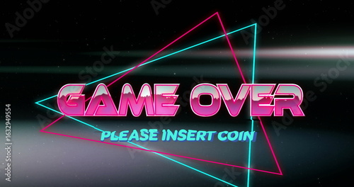 Fototapeta premium Glowing neon pink GAME OVER, cyan PLEASE INSERT COIN in space, overlapping triangles, light streaks