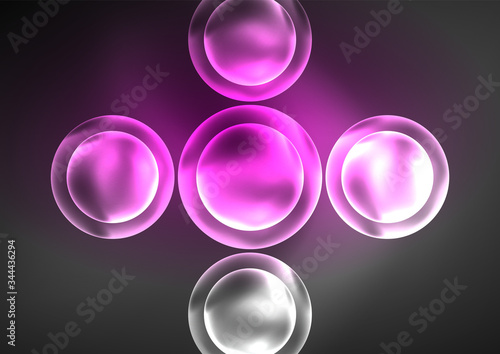 © antishock, Fototapeta premium Glowing neon shiny transparent bubbles, glass circles or bio cell concept. Techno futuristic vector abstract background For Wallpaper, Banner, Background, Card, Book Illustration, landing page