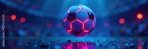 Fototapeta premium Glowing neon soccer ball suspended in mid-air, surrounded by vibrant blue...