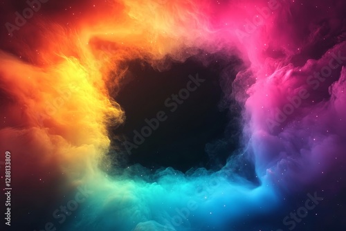 Fototapeta premium Glowing neon starlight and particles arranged in a square shape create an abstract scene, symbolizing a concept of fantastic sparkle dust with a hole frame set amidst the nebula space, all made