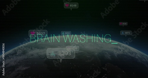 Obraz premium Glowing neon-teal BRAINWASHING_ hovering Earth horizon, showing bubbles with icons counters, glitch