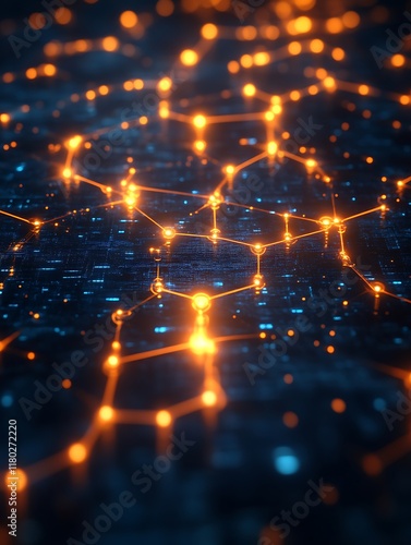 © Zizi, Obraz premium Glowing network nodes on dark surface.