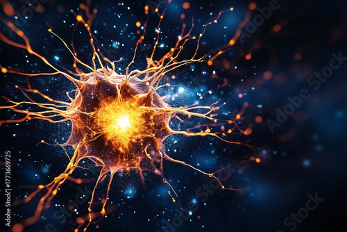 © Raul, Fototapeta premium Glowing Neuron Cell is Shown with Dendrites Expanding Outward on a Dark Blue Background.