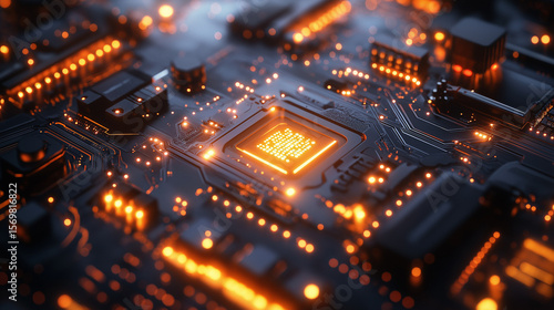 Obraz premium Glowing orange circuit board with central processor technology computer