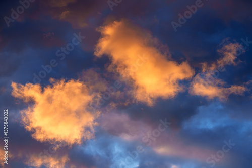 © Hanna Tor, Obraz premium Glowing orange clouds illuminate a deep blue sky during a dramatic sunset.