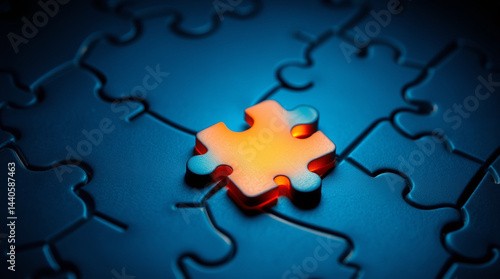 Obraz premium Glowing orange puzzle piece stands out on dark blue abstract texture background creating striking contrast and intriguing texture effect