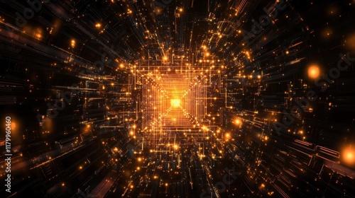 © Justlight, Fototapeta premium Glowing orange squares create a mesmerizing tunnel effect, moving dynamically through digital cyberspace and establishing a vibrant, futuristic backdrop filled with energy and innovation