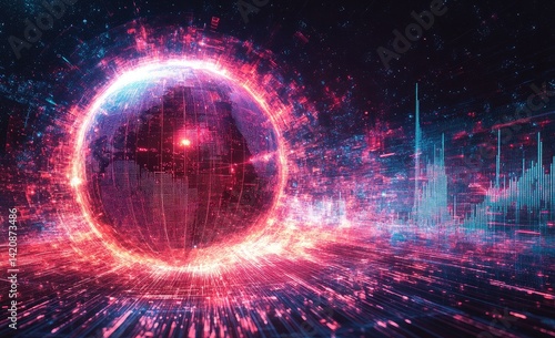 Obraz premium Glowing orb representing global data flows, surrounded by dynamic financial charts