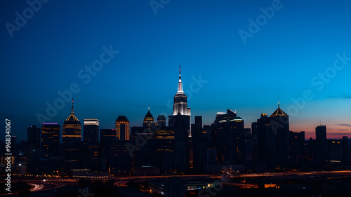 Naklejka premium Glowing outline of a city skyline at dusk, capturing the transition from day to night, city glowtime, urban and dynamic.