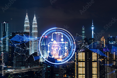 © VideoFlow, Obraz premium Glowing padlock hologram, night panoramic city view of Kuala Lumpur, Malaysia, Asia. The concept of cyber security shields to protect KL companies. Double exposure.