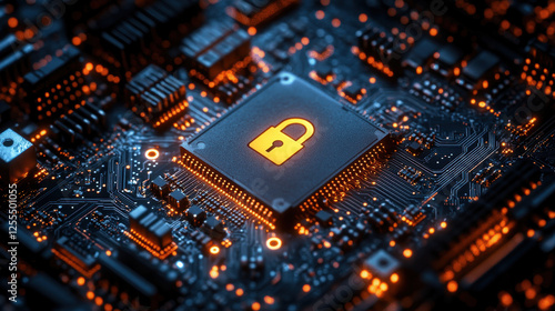 Fototapeta premium Glowing padlock on microchip is securing computer circuit board, enhancing...