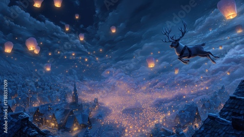 Naklejka premium Glowing paper lanterns drift above snowy forest at twilight with sparkly...