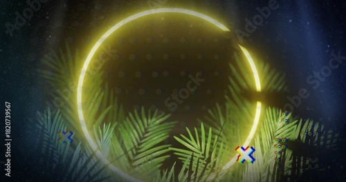 Obraz premium Glowing partial yellow neon ring dominating graphic stage backdrop, with palm fronds and glitch Xs