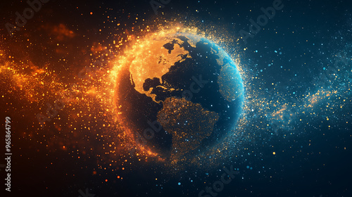 Fototapeta premium Glowing Particle Earth with Fiery Data Stream in Digital Space