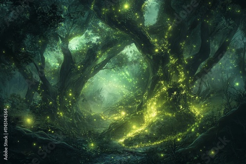 © jambulart, Obraz premium Glowing path through enchanted, dark green forest.