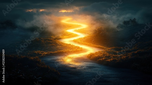 Fototapeta premium Glowing path through misty landscape, sunrise, fantasy, hope, spirituality