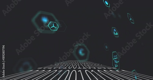 © vectorfusionart, Naklejka premium Glowing pathway lined with binary 0s 1s receding toward horizon in cyberspace, with cyan holograms