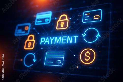 © Saleem, Fototapeta premium Glowing payment interface with credit cards and security icons display