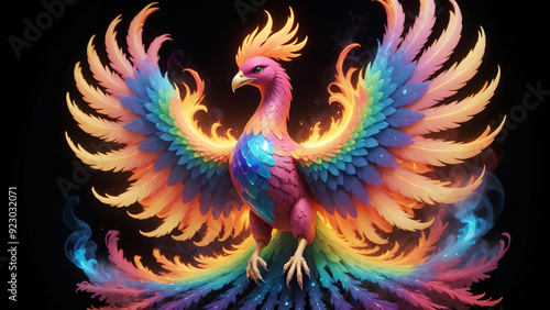 Obraz premium glowing phoenix rising from a kaleidoscope of neon rainbow smoke