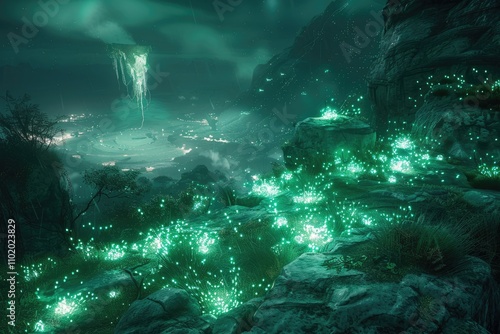 © boler, Obraz premium Glowing Plants on a Rocky Cliff Overlooking a Distant City