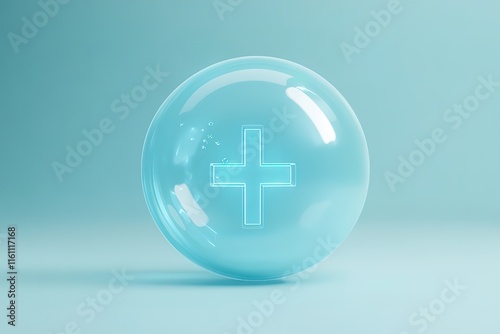 Obraz premium Glowing plus sign inside a transparent sphere. Minimalist design, clean...
