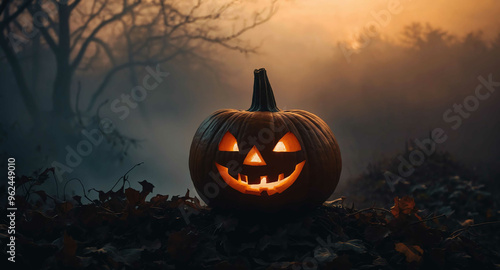 Fototapeta premium Glowing pumpkin silhouette fog abstract background