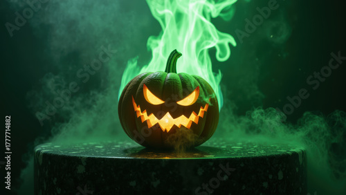 Naklejka premium Glowing pumpkin with sinister grin emits green smoke, creating spooky...