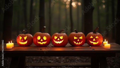 Fototapeta premium Glowing Pumpkins and Candles in the Forest