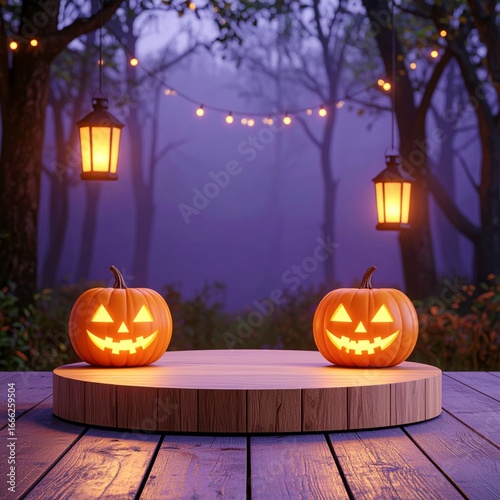 Obraz premium Glowing Pumpkins on Wooden Platform with Forest Background and Lanterns at Night