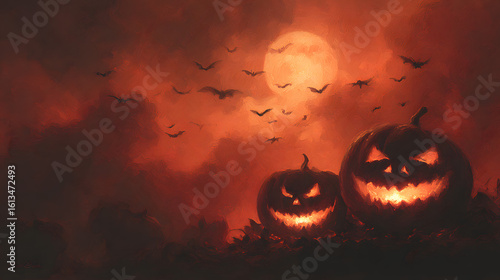 Fototapeta premium Glowing pumpkins with eerie faces illuminate the night, accompanied by silhouetted bats flying against an orange-hued backdrop.