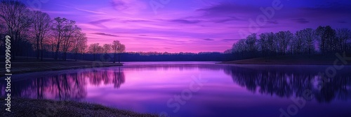 Fototapeta premium Glowing purple sky over a tranquil lake at dusk with reflections